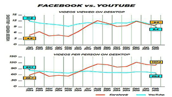 Facebook、Twitter是互动社交视频网站模式的典型代表。开展视频业务是Facebook的一种新的商业模式, 利用的是庞大的用户量和企业品牌, 其盈利模式是收取所有收入的30%, 同时保留所有的广告收入。目前还在探索电影在线播放模式, 一旦成功, 将会是非常强大的网络传输机制。据Cisco Systems调查显示, 到2018年视频流量将占全球互联网的80%~90%, 除YouTube等专业视频网站外, Facebook、 Instagram、Twitter等社交网站视频发展迅速, 尤其Facebook, 和2014年1月相比, 2015年1月Facebook每个用户视频收视增长91%; 而YouTube则下降9.9%(如图1)。