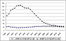 而在香港、上海两地对外贸易额快速增长的同时, 香港自身贸易出口额(内生贸易)在1995年达到最高峰, 其后持续下滑。而上海自身贸易出口额除了受金融危机的影响在2009年出现过下滑之外, 一直呈现出比较稳健的势头。从自身出口额来看, 这两者之间的差距也日益明显。图2显示, 香港贸易额占中国GDP的比重在1992年达到最高峰146.7%, 其后一路下滑。尽管2003年中央政府与香港政府签署了CEPA协议, 而且仍在不断补充内容, 但并没有改变香港贸易比重下滑大趋势, 与上海所占比重已基本一样。