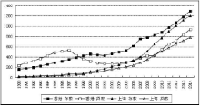 2001年之前, 虽然上海贸易额开始增长, 但香港货物贸易总额远远超过上海, 香港作为中国经济贸易中转站的角色显而易见。不过, 随着中国2001年加入WTO, 上海贸易额开始迅速增长, 与香港之间的差距越来越小(如图1所示)。