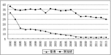 当前, 随着香港工业的衰退和内地开放程度的日益提高, 香港服务业与内地经济之间的融合度已越来越低。例如2000年时广州港的货物吞吐量是香港的1/2多一点, 但是到了2011年时已经比香港高出1/3。在此背景下, 香港的金融、贸易物流等行业的优势在慢慢消失, 这是香港经济逐渐丧失增长动力的内在逻辑[8]。